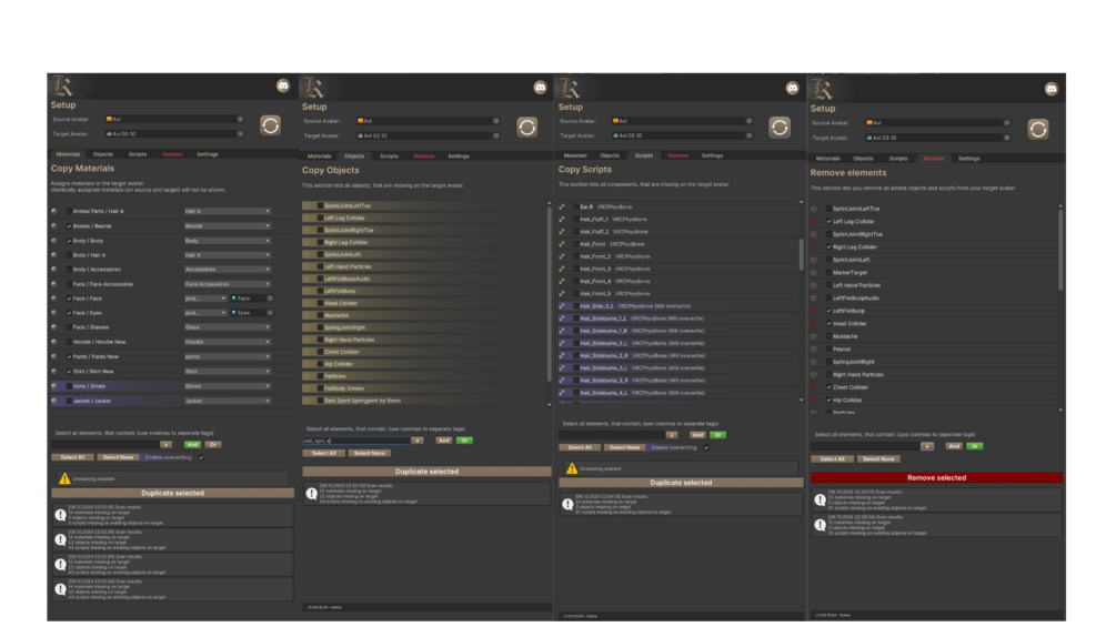 - VRCFury. Those scripts will be duplicated, but not reassigned. You will get log entries for each Fury script found, so you can walk through the list and make changes, if necessarry.